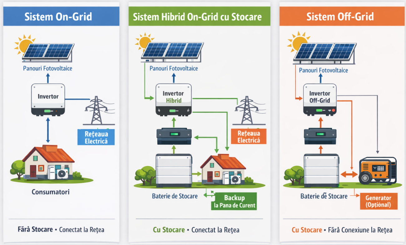 Sisteme on-grid (cu sau fără stocare) vs. off-grid (autonome cu stocare)